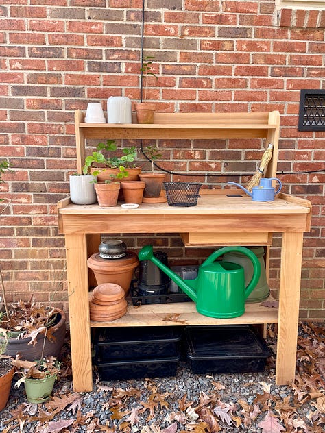 TJ got me a potting table for Mother’s Day last year, and I instantly went to the Internet for tips from someone about how they set theirs up, and what was helpful and what wasn’t, and all the things we now expect to learn from strangers giving their thoughts away for free…