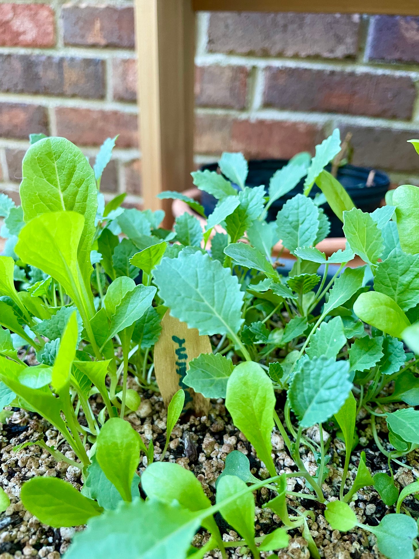 The whole crowded planter is growing strongly like a little portable salad bar.