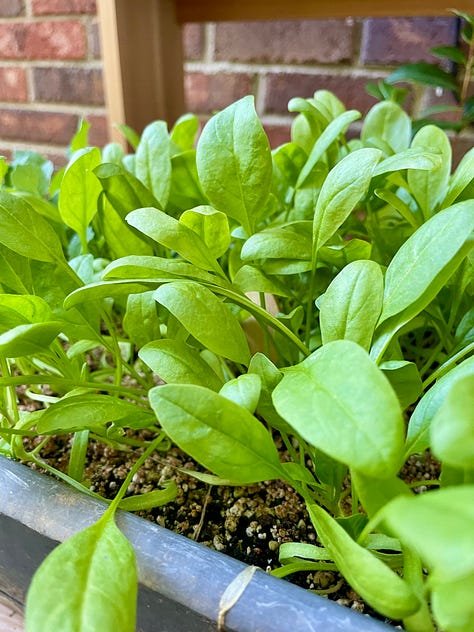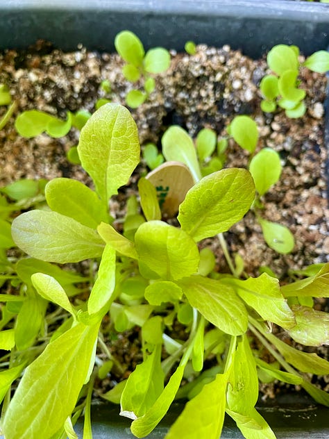 Within days I had sprouts, and after true leaves emerged, I started pricking some out to grow in a less crowded environment using Julie Thomson-Adolf’s suggestion of a kitchen fork. Honestly, I’m not sure separating those out has made a difference (thought the fork works great!): The whole crowded planter is growing strongly like a little portable salad bar. But now I also have cell trays of 10 or so of each type of green for transplanting later.
